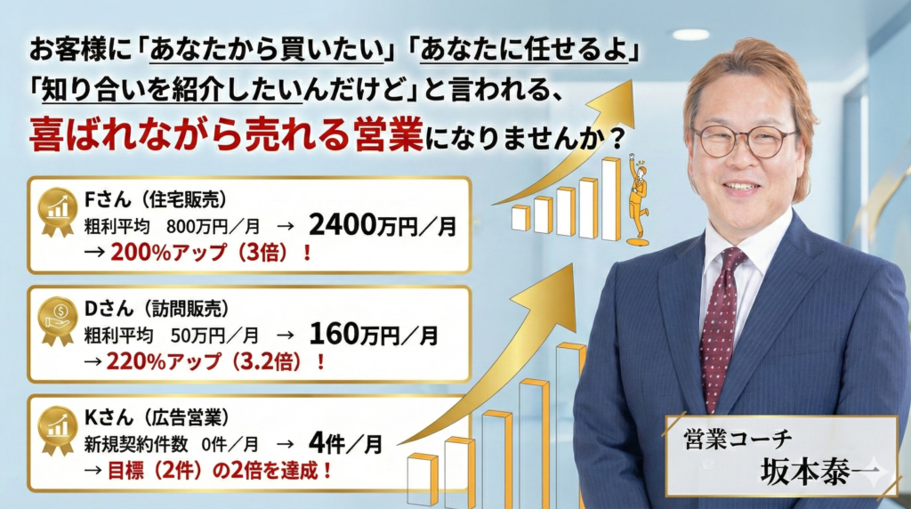 その後も多数の業界でトップ営業をとり続けた坂本コーチが