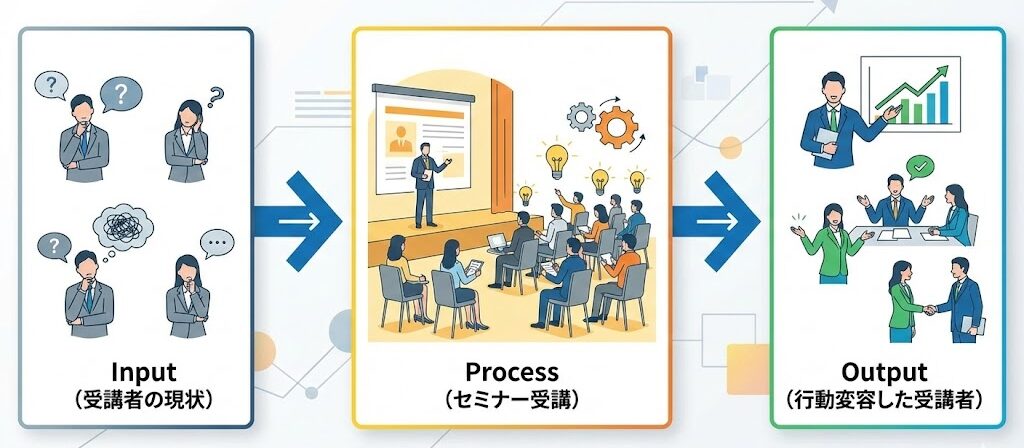 「IPO(Input-Process-Output)」のフレームワークを用いてセミナーを設計します。